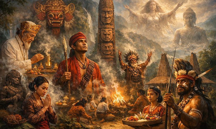 Sebelum masuknya agama-agama dunia, masyarakat Nusantara telah memiliki sistem kepercayaan yang kuat dan terstruktur. Kepercayaan ini sering disebut sebagai agama lokal, kepercayaan asli, atau oleh para peneliti disebut animisme dan dinamisme, meskipun istilah tersebut sebenarnya kurang sepenuhnya mewakili kompleksitasnya. Masyarakat Nusantara percaya bahwa alam semesta dipenuhi kekuatan adikodrati: roh leluhur, penjaga alam, dan kekuatan ilahi tertinggi yang mengatur keseimbangan hidup.